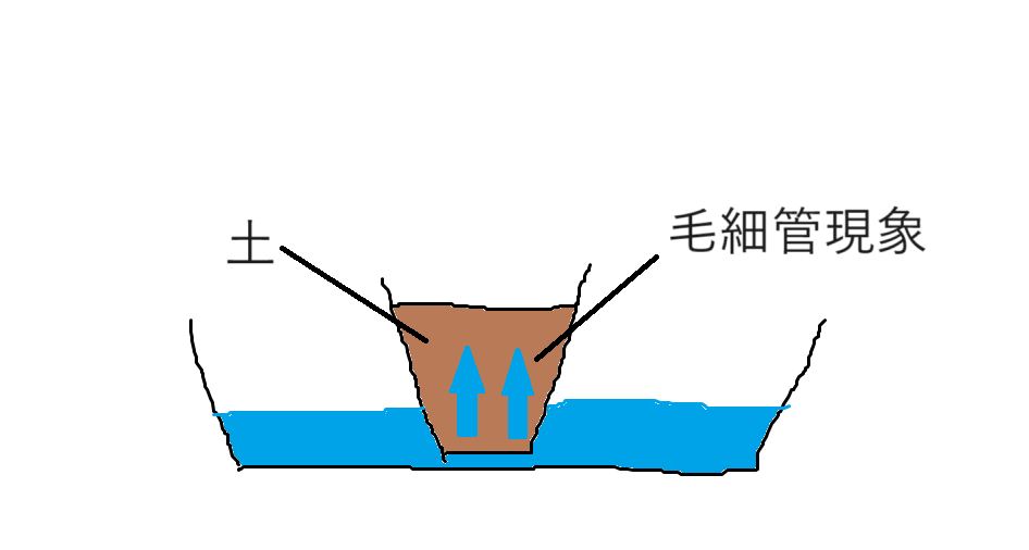 このとき植木鉢の土の高さまで溶液を溜めていませんよね。植木鉢の土は水に浸かっていない部分と水に浸かっている部分があります。